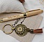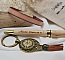 Originele sleutelhanger van verouderd messing, met een vergrootglascabochon met beige wijzerplaat van een zakhorloge, op een ster, met een lichtbruine suède pompon en een hartvormige bedel als hanger. Hoogte: 10 cm, breedte: 3,5 cm.
