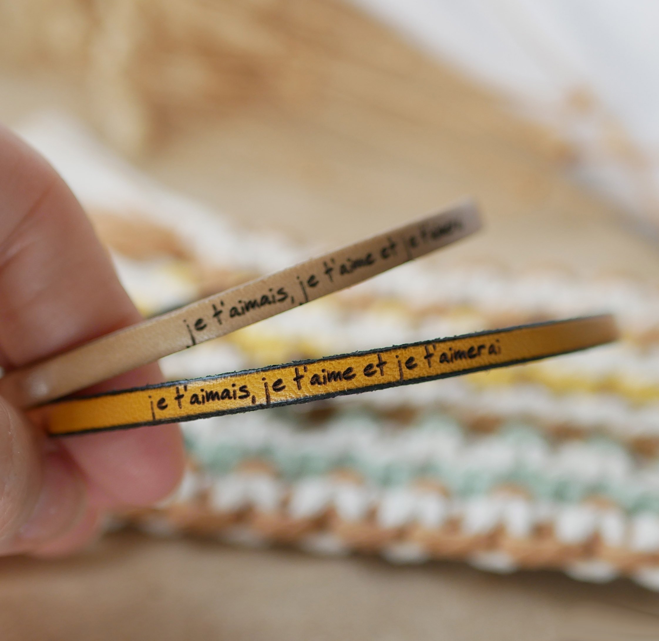 Een cadeau voor een stel: twee gepersonaliseerde armbanden van fijn leer met dezelfde tekst: GPS-coördinaten van een speciale plek, de datum van een gebeurtenis, de voornamen van geliefden of kinderen, dezelfde inspirerende quote? Een geweldig cadeau-idee voor een huwelijksverjaardag, voor de bruid en bruidegom, voor geliefden of beste vrienden.